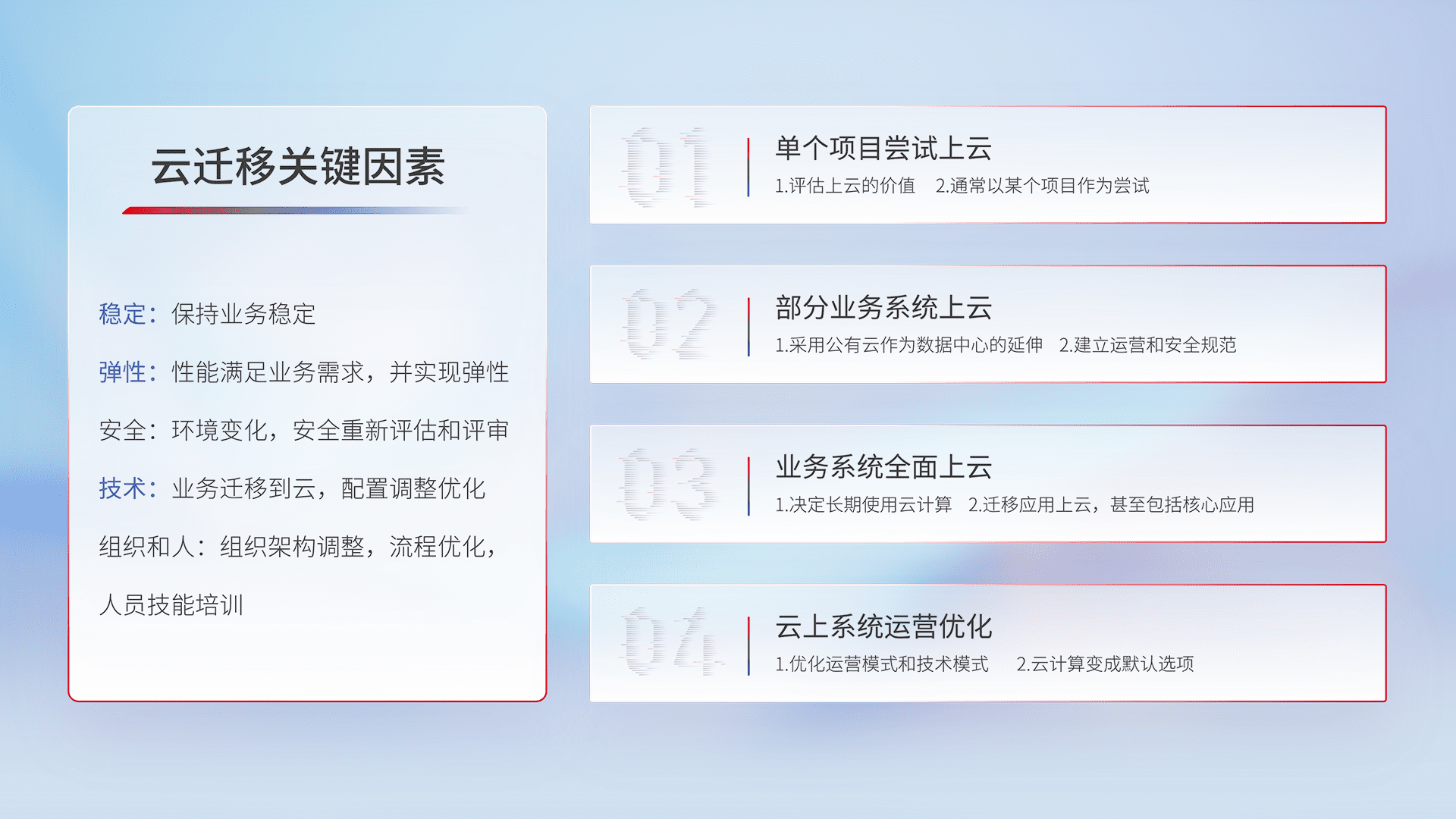 结合实际业务,,,,从规划设计、、云平台选型、、、、云原生改造、、、数据迁移、、、、集成交付,,,,迁移全过程为客户识别最佳上云路径,,做好风险识别管理,,设计网络架构、、、身份权限、、、安全审计合规、、、操作审计、、日志审计、、监控告警策略、、、、多站点容灾设计等,,对云上基础设施进行整体规划,,提升IT治理水平,,以满足弹性、、高可用、、高性能的需求。。。