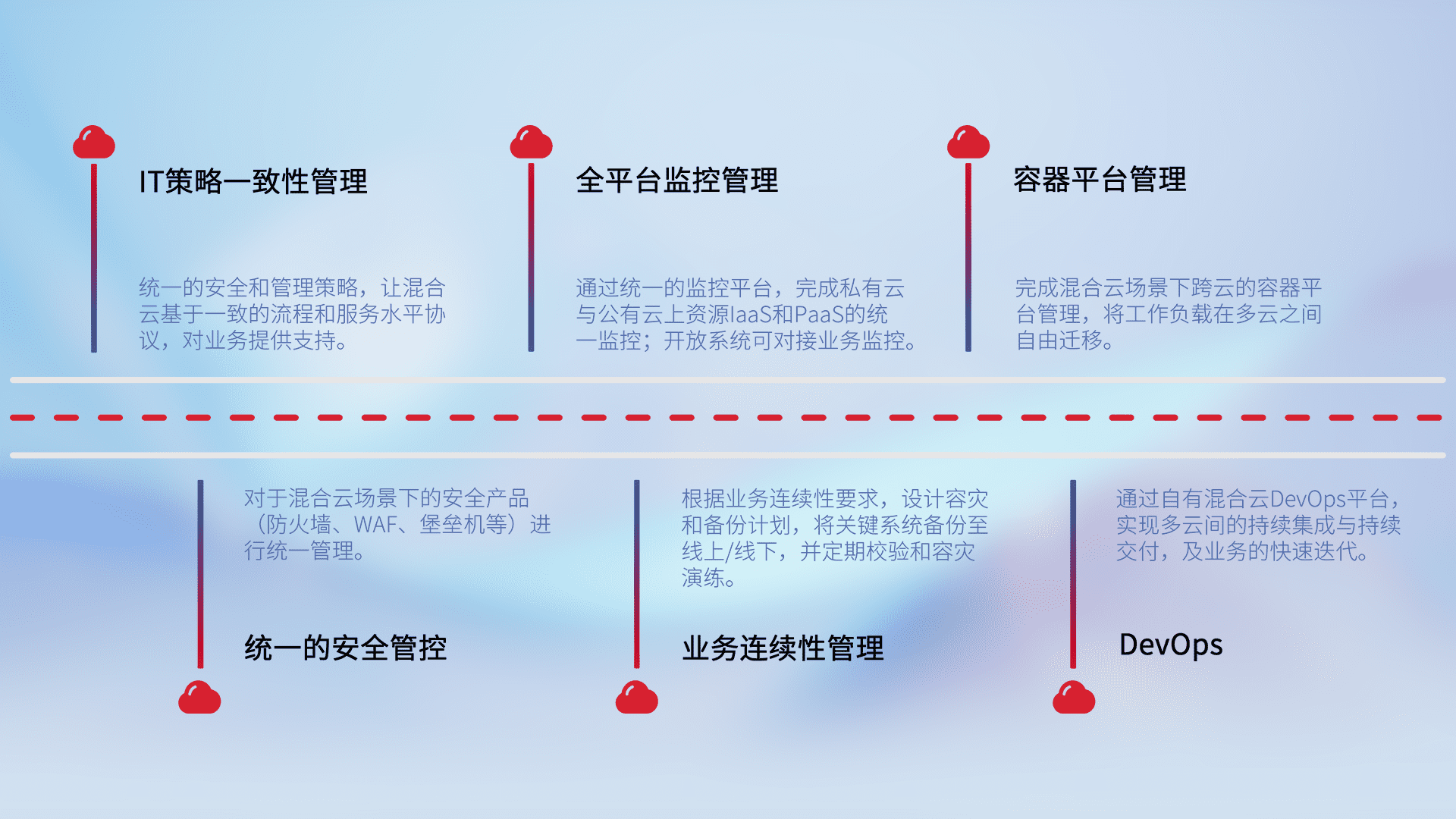 通过多云纳管,,,以统一的资源数据模型把客户的云资源进行抽象和封装,,进而实现对多云资源的统一操作,,保障云资源管理的可靠性、、、稳定性与可用性。。。量身定制化运维内容,,,配置、、开发运维、、、补丁管理、、备份、、、监控、、认证和访问管理、、、审计和日常巡检等,,保障在用云过程中的可靠度,,,,稳定度以及高可用率。。。。