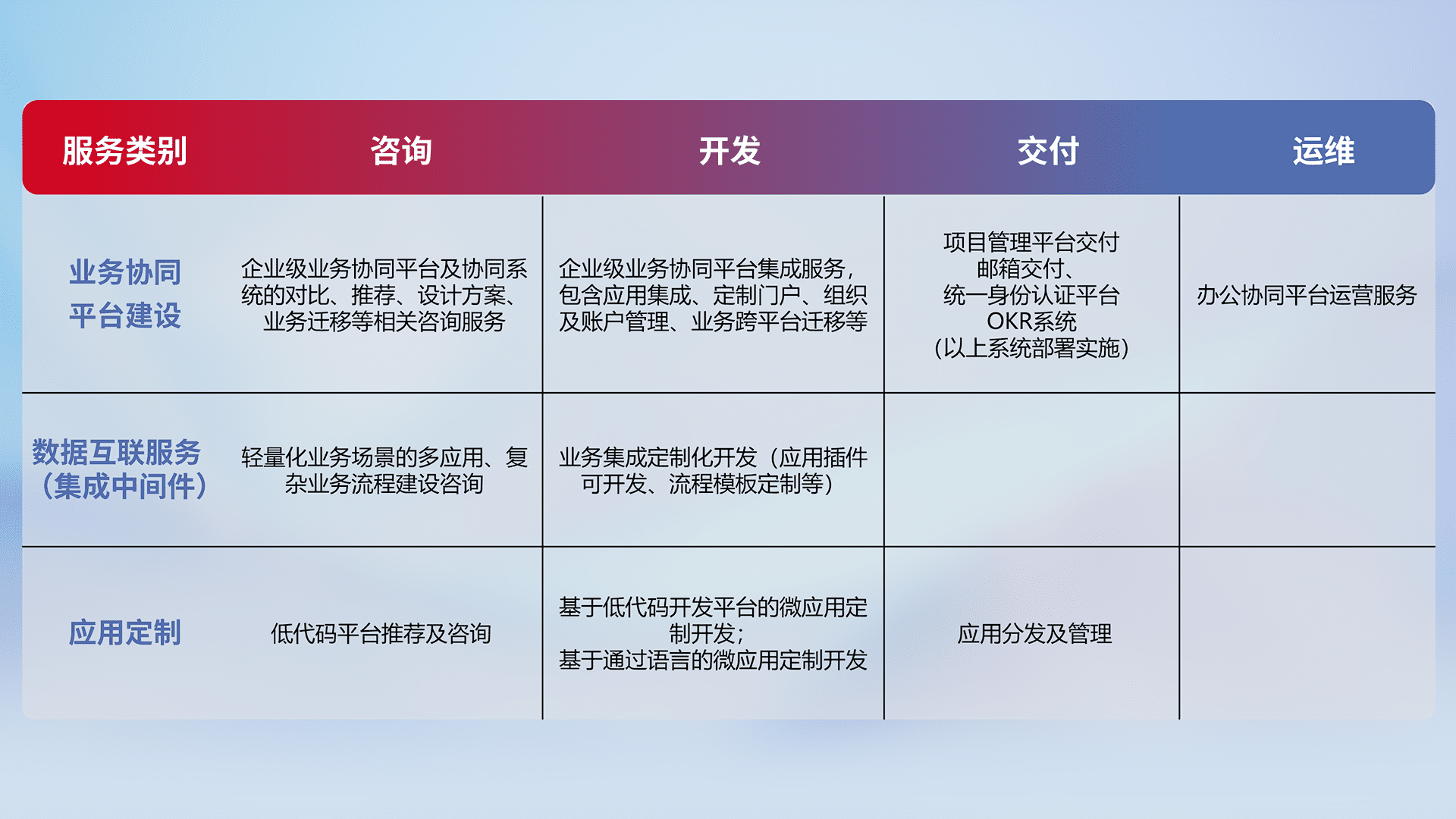 针对钉钉、、、企微、、IDaas等平台级产品提供产品的规划、、、方案、、交付、、定制化开发等服务,,,,实现如统一协同办公、、智能客户服务、、、、混合会议管理、、、、智能数据查询、、、等业务场景,,,实现数字化转型。。。